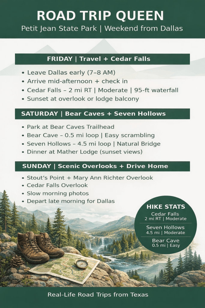 If you’re looking for an easy, adventure-packed getaway from Dallas, Petit Jean State Park is one of the best bang-for-your-buck road trips within 6 hours. Think: waterfalls, slot-like rock formations, canyon views, and sunset overlooks — all in one weekend.