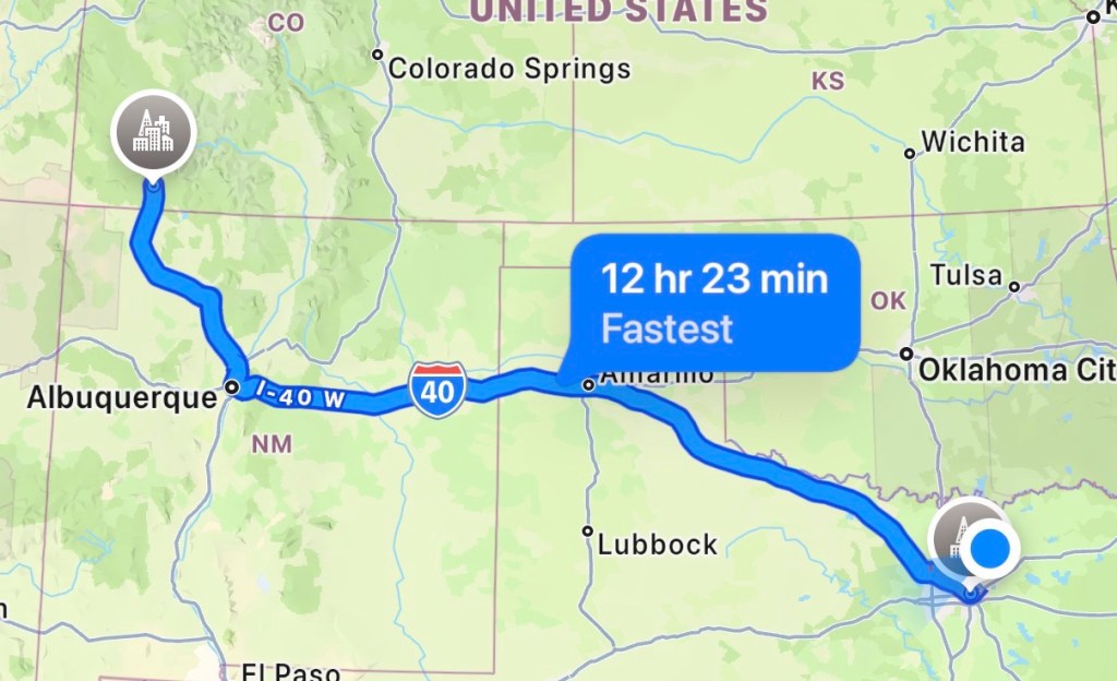 Suggested stops: Amarillo (quick lunch + gas) Cadillac Ranch (5–10 min fun stop) Trinidad, CO (stretch break before mountains)