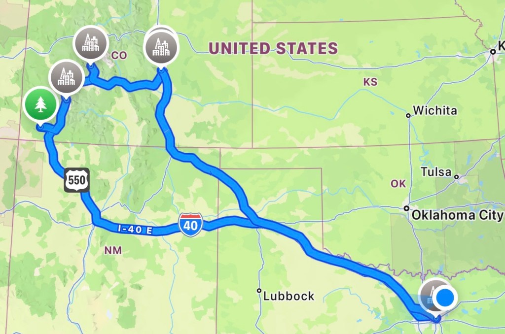 Dallas → Colorado Springs → Crested Butte → Ouray → Silverton → Mesa Verde → Texas