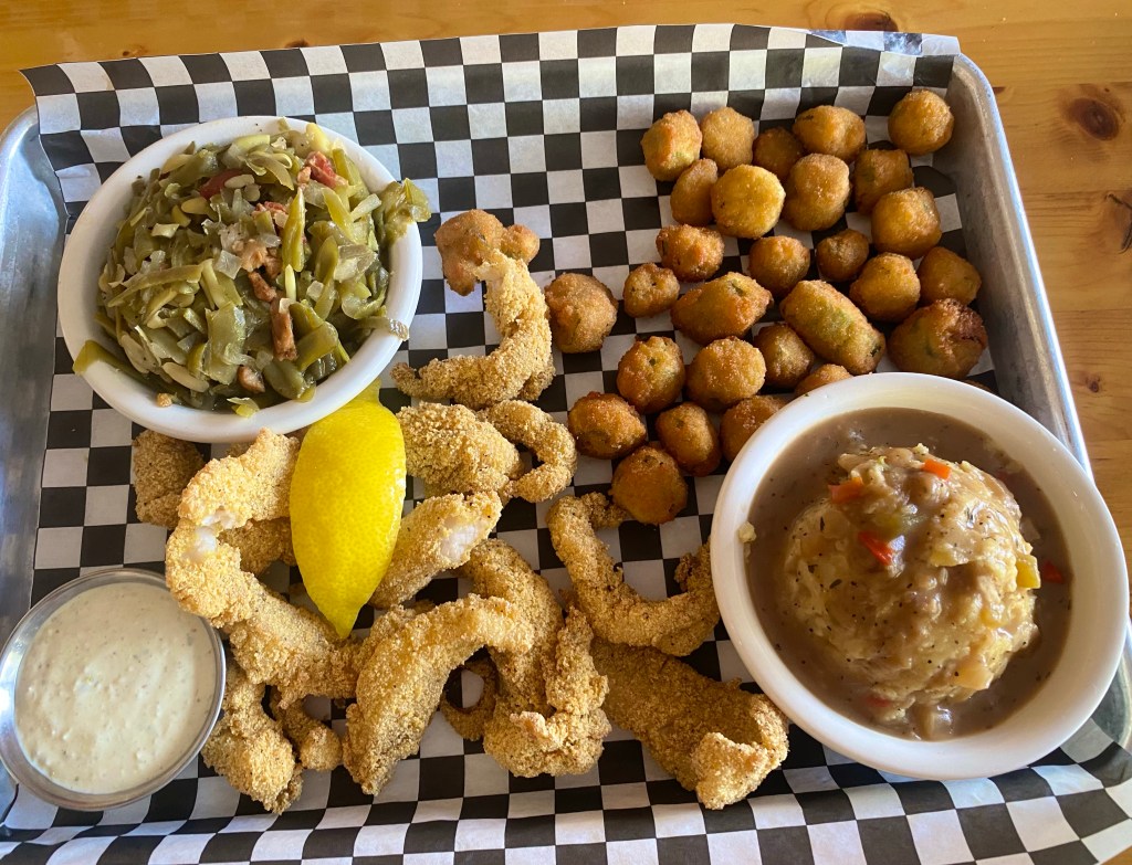 Fried fish bites with green beans, mashed potatoes, and fried okra