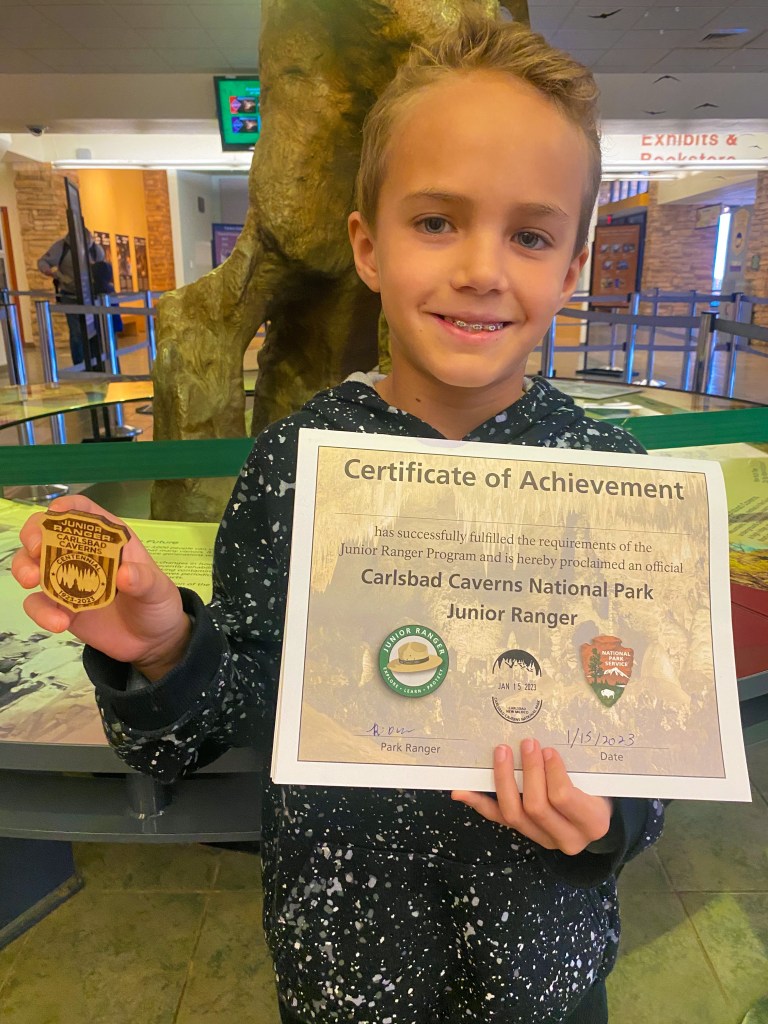 To the left of the Big Room is an area with snacks and restrooms. We did grab a bite to eat while there and the boys rested their legs for a bit. Then we continued on to the Big Room and when we finished, we opted to ride the elevator back up. Since we were visiting in the off-season, there wasn’t a wait at all for the elevators. But I have heard that in the summer the wait can exceed an hour. We ventured around the museum and then Jake was sworn in as a Jr. Ranger and received the Centennial Badge because Carlsbad Caverns turns 100 years old this year!