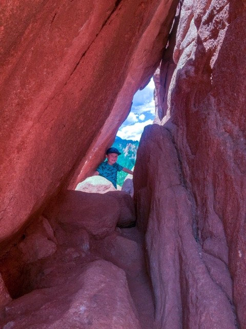 We Ubered over to the Garden of the Gods visitor center to start out our day trip. It has restrooms, a few exhibits, a cafe/coffee shop, a souvenir shop, movie theater (that details the formation of this land form), a 2nd story viewing balcony, and a lower level desk that offers different tours – like by jeep or trolley. I believe they also offer free shuttles that drive you across the street where the rock formations are. We chose to walk, we had been stuck in the last hotel for 3 days and then again in the car the whole day before, so it was nice exercise for all of us! We packed a backpack full of drinks and a few snacks for the hike. I think next time we might pack a picnic lunch to take with us. (I’ll get to the food part later!)